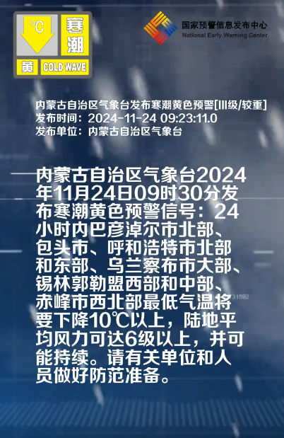 内蒙古自治区气象台2024年11月24日09时30分发布寒潮黄色预警信号:24小时内巴彦淖尔市北部、包头市、呼和浩特市北部和东部、乌兰察布市大部、锡林郭勒盟西部和中部、赤峰市西北部最低气温将要下降10℃以上,陆地平均风力可达6级以上,并可能持续。请有关单位和人员做好防范准备。