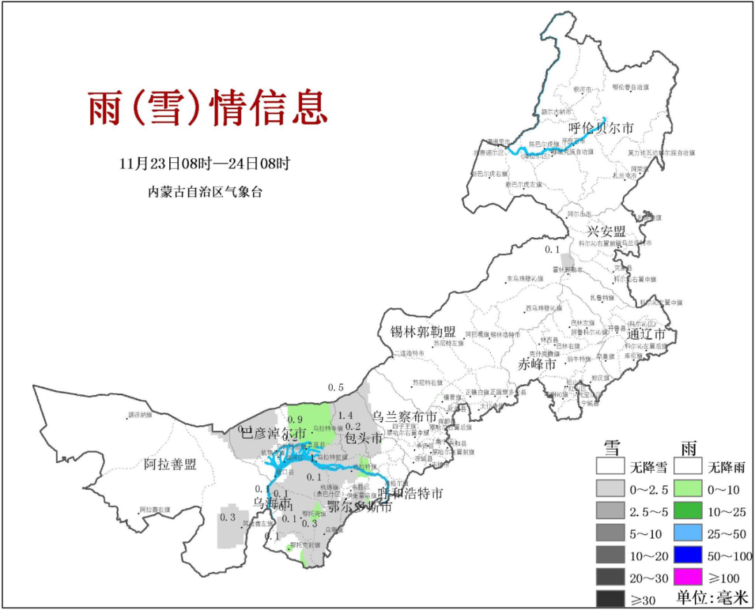 昨天白天,内蒙古大部地区以晴或晴间多云为主,最高气温处于5~8℃之间。夜间,强冷空气开始搅动西部地区的天气,风雪上线。监测显示,23日08时-24日08时,全区6个盟市19个旗县的56个站点出现降水,降水主要出现在鄂尔多斯市、包头市、巴彦淖尔市。其中,22个站出现小雨,34个站出现小雪。鄂尔多斯市伊金霍洛旗乌兰木伦、达拉特旗昭君降雪量均为1.7毫米;包头市达尔罕茂明安联合旗降雪量1.4毫米。