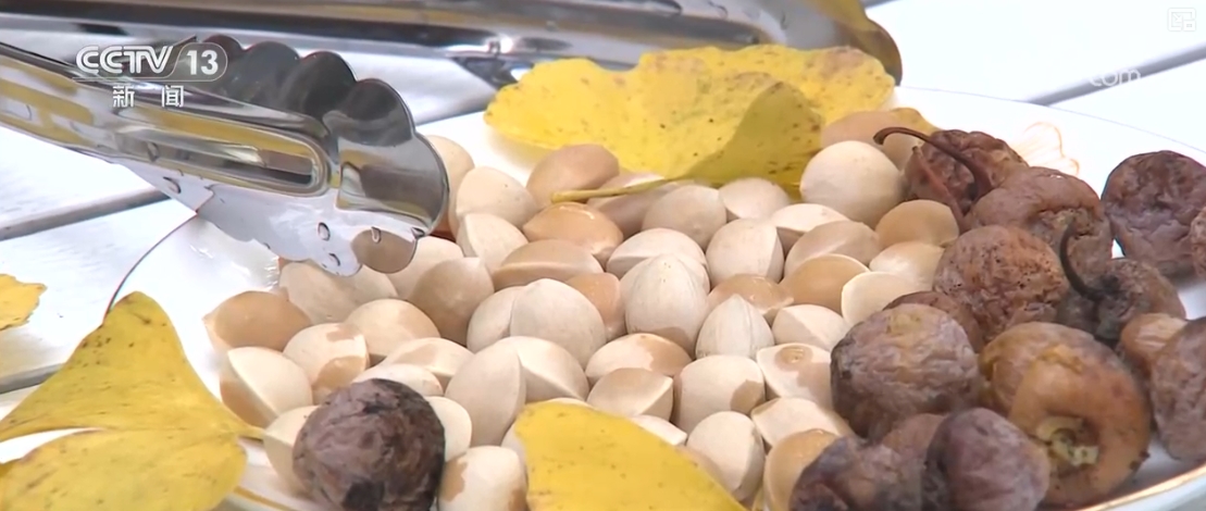 身在银杏村,这里的乡亲们也是开发研制出了很多既安全又美味,还能发挥银杏果“药食两用”特性的特色美食。村子里最常见的,是用炭火慢慢翻炒出的干果。还有将银杏果、松子、核桃和芝麻等食材混合炒熟,再用木锤使劲敲平制成的银杏酥,味道也是油润香甜。