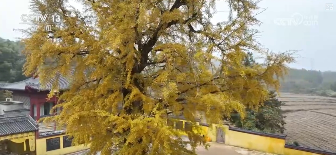 在江西抚州临川区,一株千年银杏树迎来了最佳观赏期。一片片黄色的银杏叶犹如一串串金色风铃,挂满树梢。