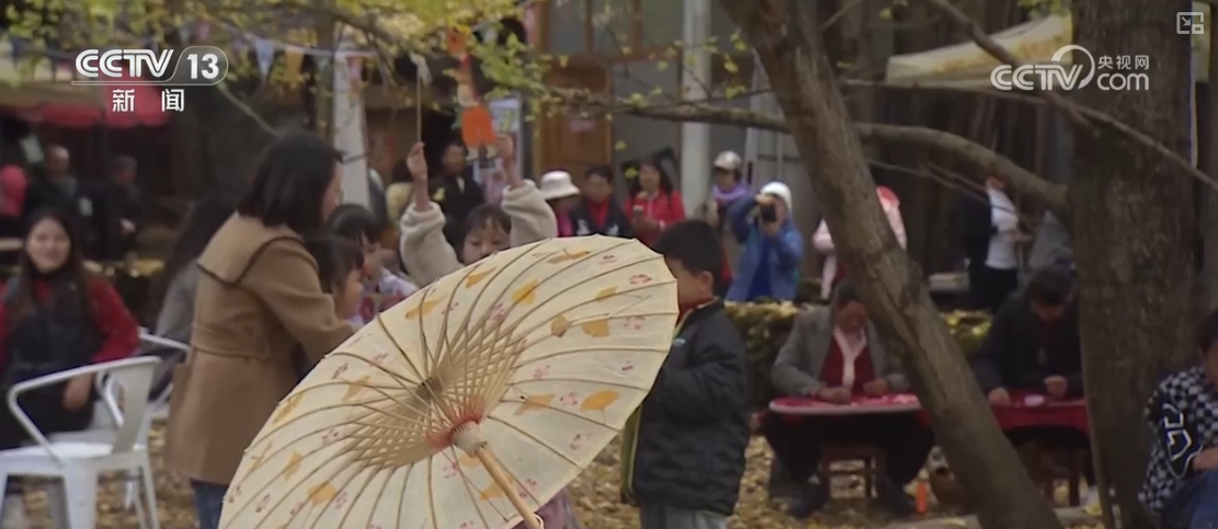 在最佳观赏期来到村子里,游客朋友们还能看到和银杏相关的非物质文化遗产。这是已经传承了300多年的腾冲传统非遗——油纸伞。这把伞在制作阶段,就将银杏叶放入了宣纸之间。打起油纸伞,就仿佛银杏叶落在了伞上,充满意趣。