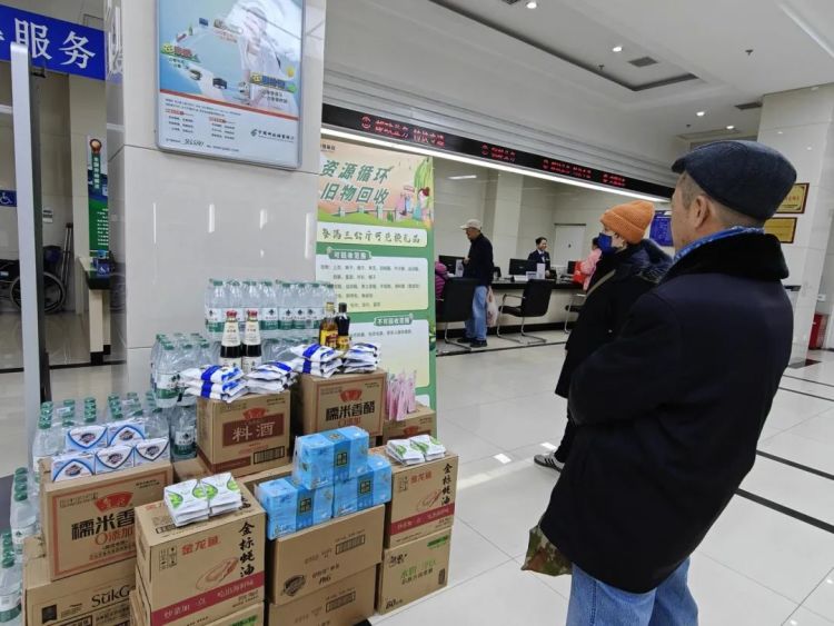 11月22日下午,北京晚报记者来到东四邮局。一进门,就看到大厅的一角摆满了旧物回收业务的兑换好物——几大箱的蚝油、料酒、米醋、香皂、矿泉水,还有小包装的食用盐、洗衣液、纸巾、湿巾等等。