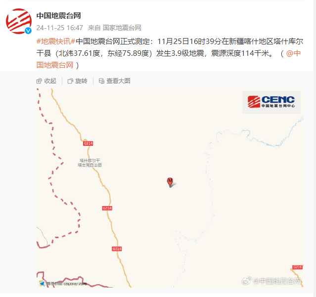 新疆喀什地区塔什库尔干县发生3.9级地震,震源深度114千米