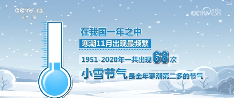 在我国一年之中,寒潮11月出现最频繁。1951年—2020年一共出现了68次,其中,小雪节气是全年寒潮第二多的节气。