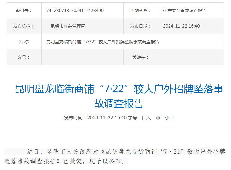 近日,昆明市应急管理局网站公布了《昆明盘龙临街商铺“7·22”较大户外招牌坠落事故调查报告》。