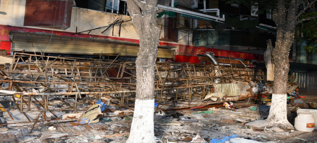 涉事建筑物金康园综合楼为四层混凝土框架结构经营性用房,建筑面积5927平方米,产权人为刘泽民。事发时,金康园综合楼共有14家承租户经营。