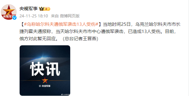 当地时间25日,乌克兰哈尔科夫市市长捷列霍夫通报称,当天哈尔科夫市市中心遭俄军袭击,已造成13人受伤。目前,俄方对此暂无回应。(总台记者王晋燕)