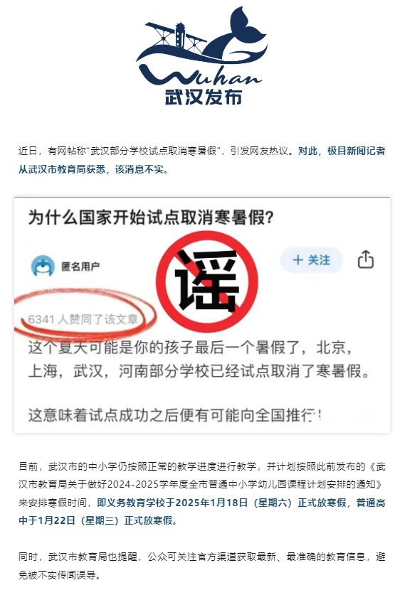 央视网消息: 据“武汉发布”公众号消息,近日,有网帖称“武汉部分学校试点取消寒暑假”,引发网友热议。武汉市教育局表示该消息不实。目前,武汉市的中小学仍按照正常的教学进度进行教学,并计划按照此前发布的《武汉市教育局关于做好2024-2025学年度全市普通中小学幼儿园课程计划安排的通知》来安排寒假时间,即义务教育学校于2025年1月18日(星期六)正式放寒假,普通高中于1月22日(星期三)正式放寒假。