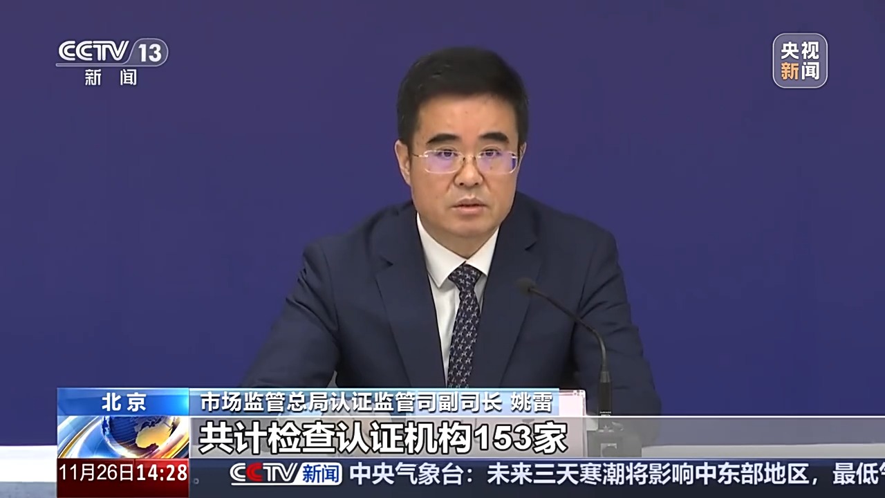 市场监管总局认证监管司副司长 姚雷:建立重点领域、重点环节监管长效机制,今年以来,共计检查认证机构153家,其中发现虚假认证机构12家,较严重问题机构16家,存在一般问题机构28家,均已依法进行处理。