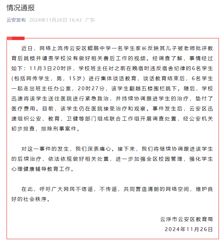 近日,网络上流传云安区鲲鹏中学一名学生家长反映其儿子被老师批评教育后跳楼并谴责学校没有做好相关善后工作的视频。经调查了解,事情经过如下:11月3日20时许,学校班主任对之前在晚宿时违反宿舍纪律的6名学生(包括网传学生,男,15岁)进行集体谈话教育,谈话教育结束后,6名学生一起走出班主任办公室,20时27分,该学生翻越五楼围栏跳下。随后,学校迅速将该学生送往医院进行紧急救治,并持续协调跟进学生的治疗,垫付了医疗费用。目前,该学生仍在医院接受治疗和观察。事件发生后,云安区迅速组织公安、教育、卫健等部门组成联合工作组开展调查处置,经公安机关初步排查,排除刑事案件。