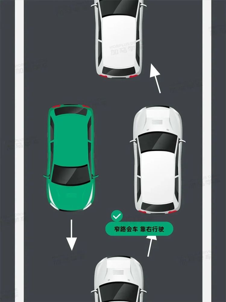 窄路会车。在窄路上会车时,一定要靠右行驶,同时降低车速,并做好随时停车避让的准备。
