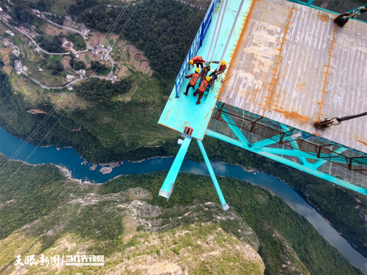 凛冬时节,寒风从有“地球裂缝”之誉的花江大峡谷上呼啸而过,一段段绿色钢桁梁被“钢铁巨爪”牢牢抓起,冲破云雾精准吊装至六百米的高空,与吊索稳稳连接。