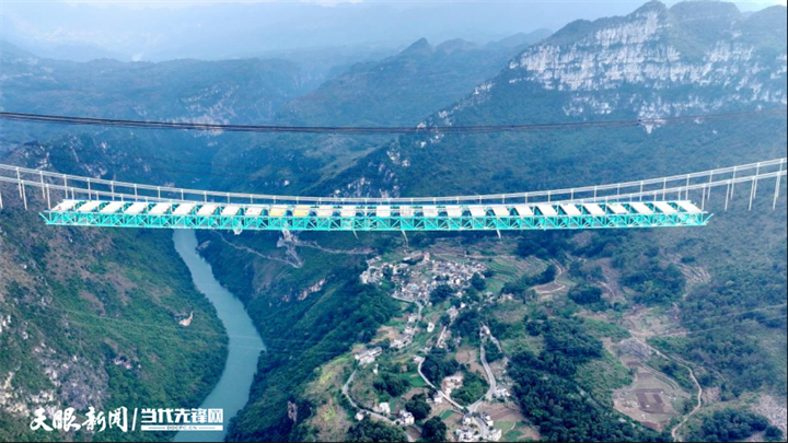 在花江峡谷大桥引桥上,两台8轴线组合式液压模块运梁车忙碌地穿梭在存梁场与引桥间,将前期拼装完成的的钢桁梁运送到引桥上“排队”。而后,世界最大跨度缆吊系统整装“上岗”。整个缆吊系统由运输系统、吊装系统、智慧监控系统等主要系统组成,缆吊跨度布置为221m+1420m+460m,缆塔最大高度为262米,缆吊跨度是目前世界之最,有效解决了山高谷深地区不具备垂直运输条件的难题。