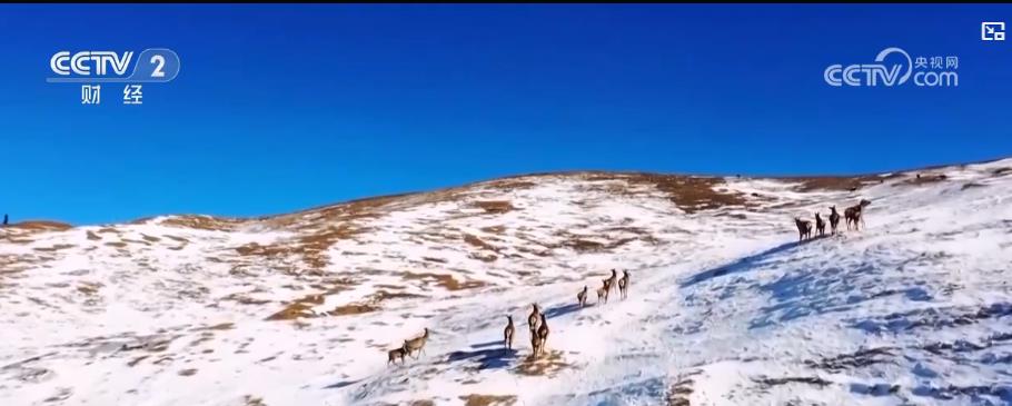 新疆的冬日美景不止于此。在昌吉市的江布拉提草原,白雪轻覆,山野苍茫。记者用无人机拍摄到野生天山马鹿,时而聚集奔跑在山谷,时而悠然漫步于山间。它们之中还有一只领头的成年雄鹿站在山脊,威风凛凛。据了解,野生天山马鹿是国家二级保护动物,栖息于海拔1500—3800米的高山草原地带。在北天山深山丛林中,自然繁殖的种群已不足1万只。新疆昌吉市江布拉提草原已连续十年发现野生天山马鹿的身影。