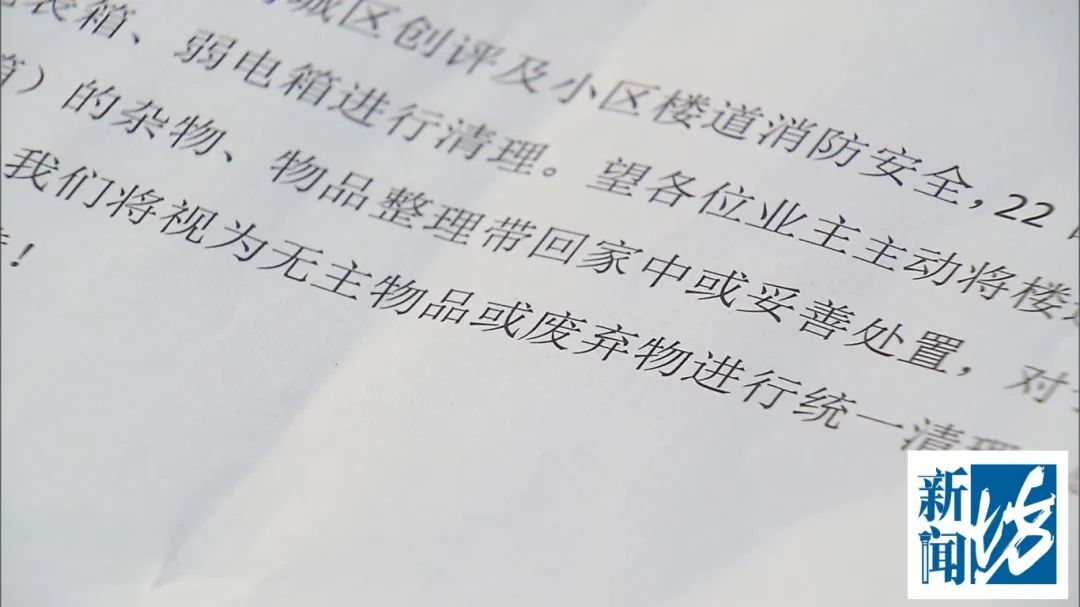 何绍文 上海先荣建筑集团物业管理有限公司项目经理:在楼栋宣传栏里,每个门洞的入口处张贴了相应的告示,并且在微信群中也发了告示,在清理的时候,我们也上门,每家每户去敲门,去通知,但是大部分都没有人,不在家,我们就采取在物品上面贴一张小卡片,让业主及时把物品清走;这个自行车我们也不懂,因为楼道里车辆比较多,储存的空间也比较狭小,所以统一放在一起。