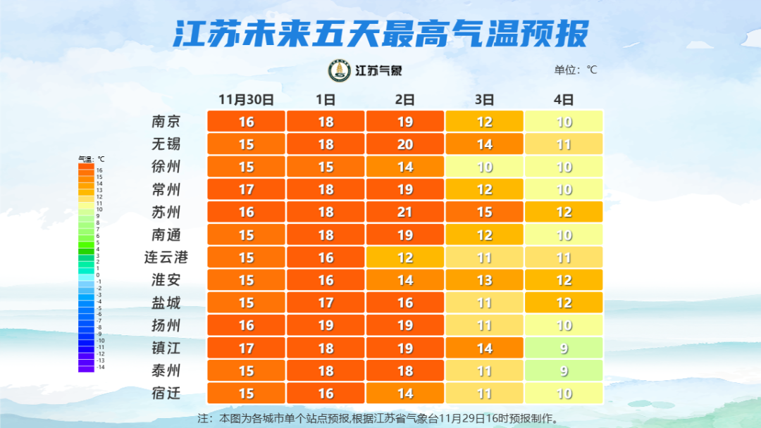 全省晴到多云。最高温度:淮北地区13℃左右,沿江和苏南地区18℃左右,其他地区16~17℃;最低温度:淮北地区2℃左右,沿江和苏南地区5~6℃,其他地区3~4℃。全省偏南风3-4级转偏北风4-5级阵风6级。