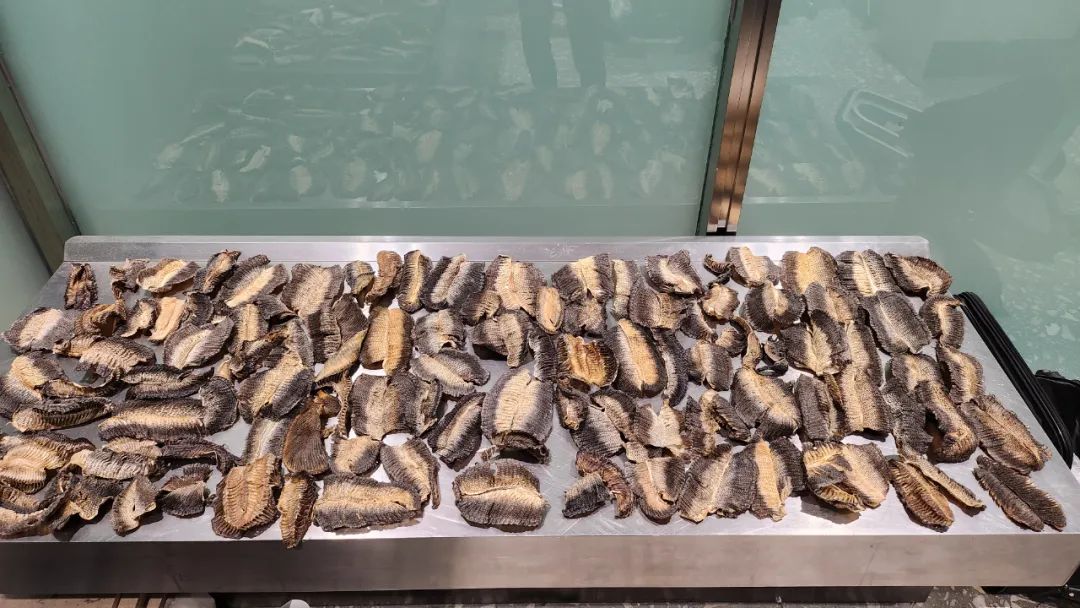 此前,大兴机场海关关员对入境旅客进行监管时,发现一名选择无申报通关的旅客行李机检图像异常,显示有大量不规则状阴影物体。关员进行开箱查验,在行李内查获大量鱼鳃制品。经清点称重,上述物品共计226件,净重5.055千克。