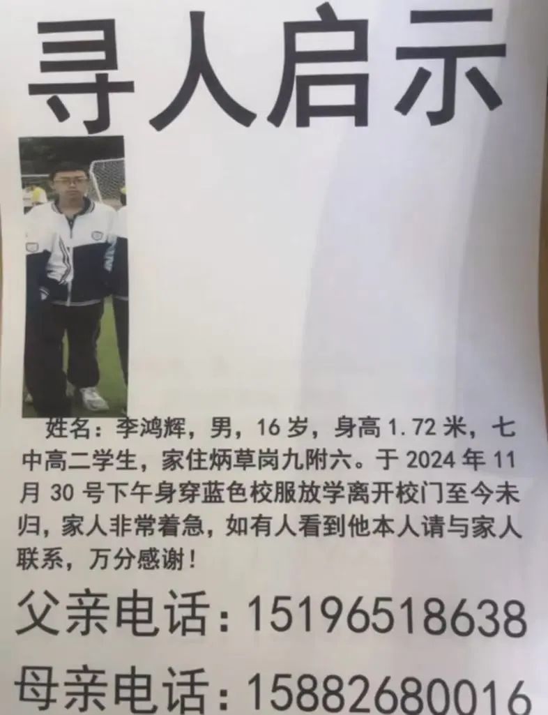 四川省攀枝花市第七高级中学16岁高二学生李鸿辉于2024年11月30日从校门口离开后走失,至今未找到。根据校门口的监控画面,李鸿辉走失时身着白蓝色校服,离开校门的时间是17点32,李鸿辉离开校门时并未携带任何东西。