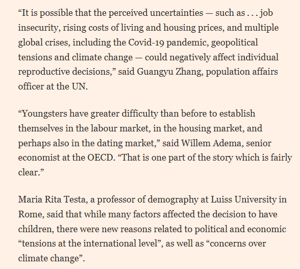 《金融时报》还引用联合国经社部人口事务官员的观点,称导致欧盟新出生人口如今加速下降的原因包括气候变化、疫情、通胀等经济问题以及紧张的地缘政治。接受《金融时报》采访的经合组织(OECD)资深经济学家威廉·阿德玛(Willem Adema)表示,年轻人比以往更难在劳动力市场、房屋市场以及婚恋市场立足。意大利的人口学专家玛利亚·丽塔·特斯塔(Maria Rita Testa)还认为,国际上的政治和经济大环境是导致如今欧盟新出生人口数量加速下滑的新因素。