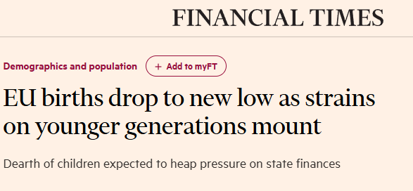 《金融时报》称,这项数据不仅低于去年欧盟统计局预估的400万的数字,而且还比2022年出生的人口数量进一步下滑了5.5%——甚至这个年度下滑的幅度,本身也创造了一项新的历史纪录。