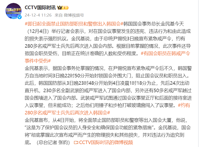 韩国国会事务总长金民基今天(12月4日)举行记者会表示,对在国会议事堂发生的违宪、违法行为和由此造成的损失表示强烈抗议。金民基说,由于总统尹锡悦3日晚宣布紧急戒严令,约有280多名戒严军士兵先后两次进入国会内部。根据目前掌握的情况,此次事件还导致国会职员受伤,目前正在统计准确的人数和受伤程度。