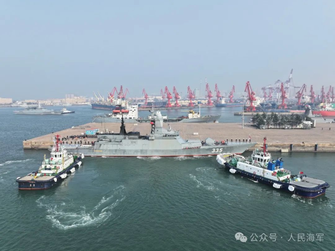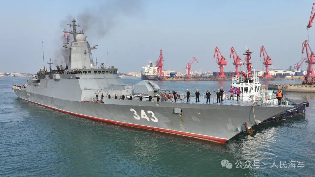 12月5日上午,在中国海军盐城舰的引导下,俄罗斯海军由“响亮”号、“凛冽”号、“阿尔塔尔·琴坚扎波夫”号护卫舰和“佩琴加”号中型海洋油船组成的舰艇编队抵达青岛某军港,开始为期5天的友好访问。