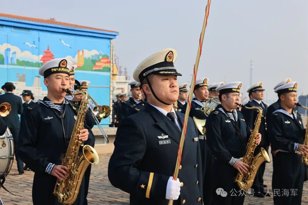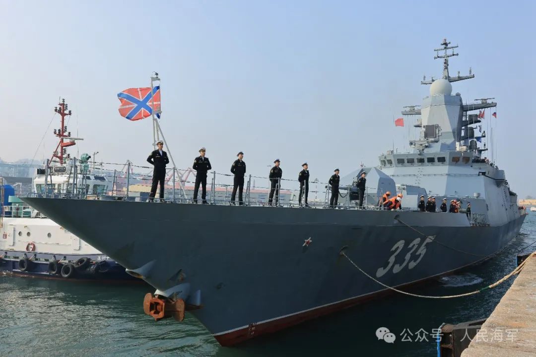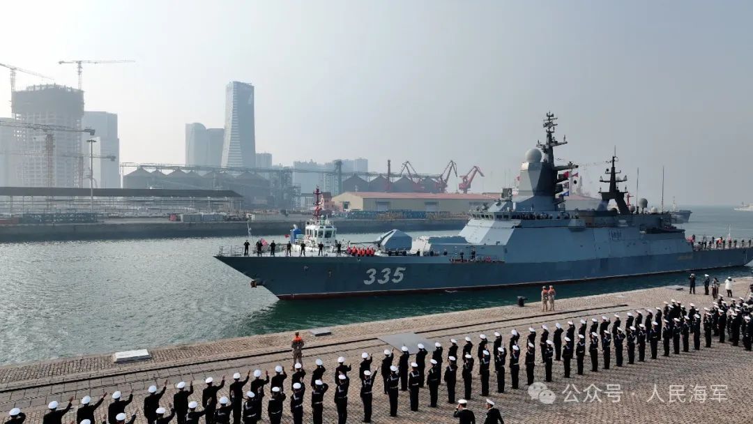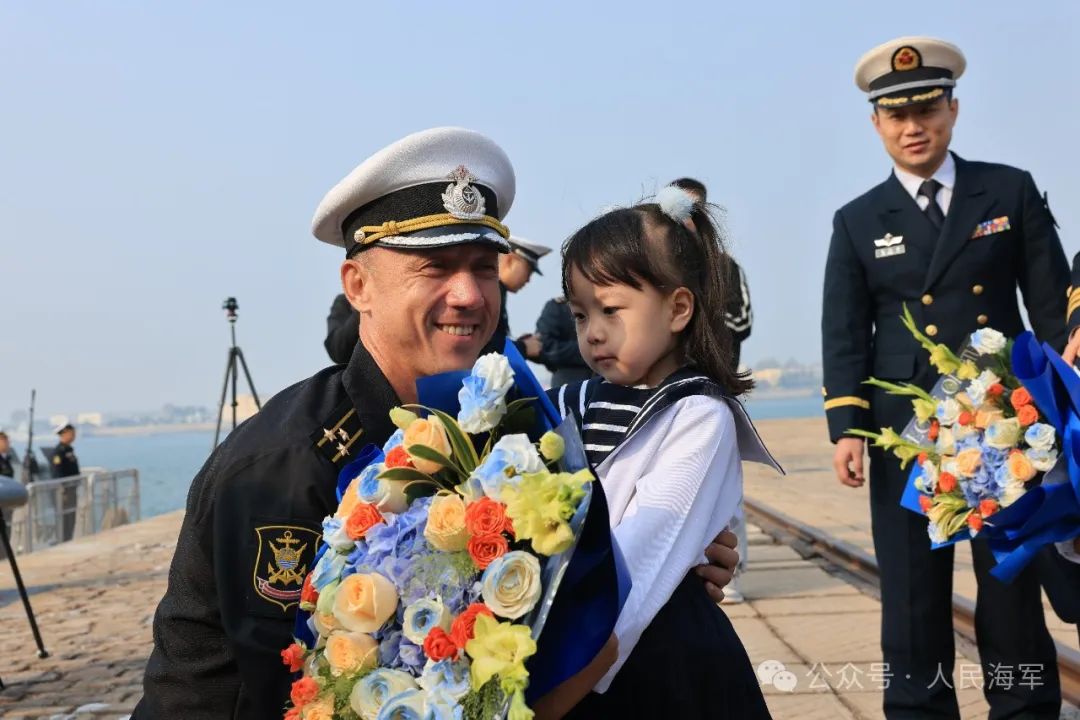 上午10时,在激昂的军乐和热烈的欢迎声中,悬挂中俄两国国旗的俄方舰艇编队,缓缓抵靠青岛某军港码头,100余名北部战区海军官兵代表到码头迎接。欢迎仪式上,中方军乐队奏响《欢迎进行曲》,中方儿童向俄方编队、舰艇指挥员献上鲜花。