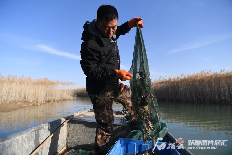 11月30日,在策勒县沙漠玉湖上,养殖人员正在捕捞螃蟹。石榴云/新疆日报记者 拍热扎提·阿不都摄
