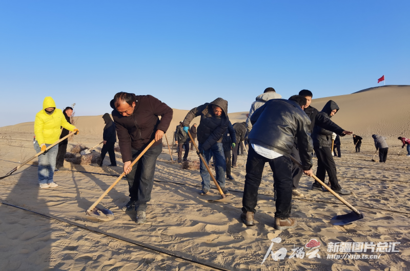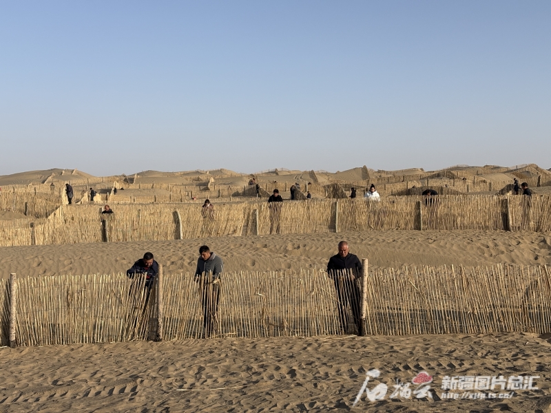 11月27日,皮山县科克铁热克镇至叶城方向沙漠“锁边”任务现场,群众正在搭建高立式沙障。阿卜力克木·依卜拉音摄