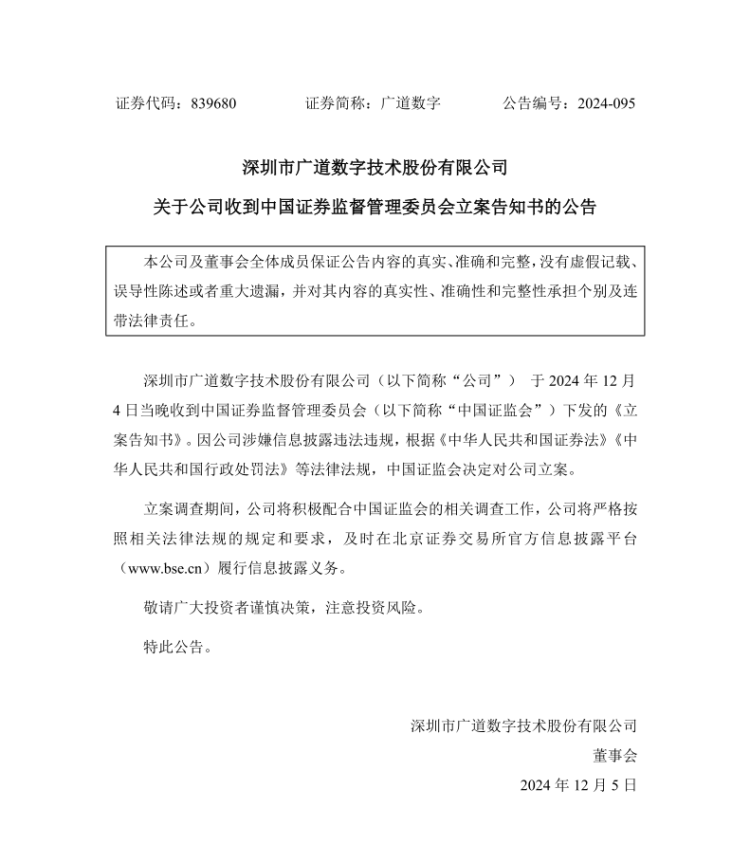 12月5日,广道数字发布公告称,收到证监会下发的《立案告知书》。因公司涉嫌信息披露违法违规,根据《中华人民共和国证券法》《中华人民共和国行政处罚法》等法律法规,中国证监会决定对公司立案。