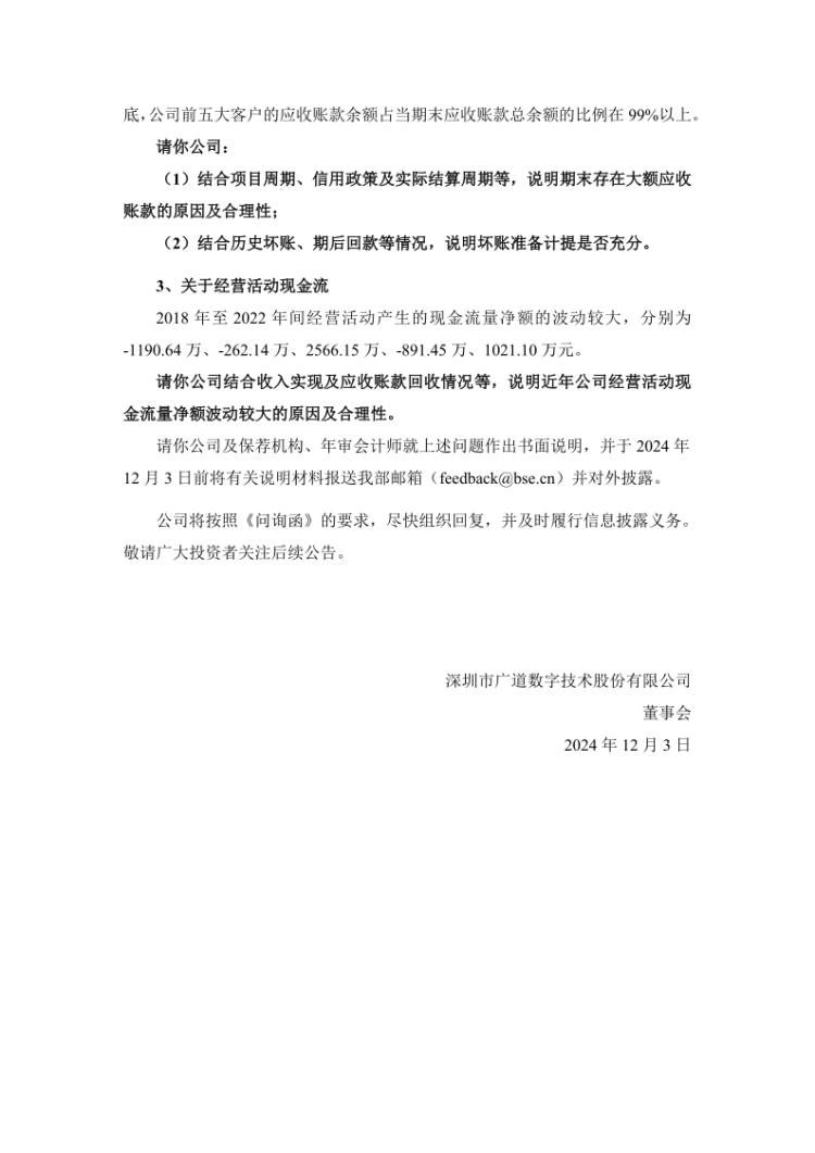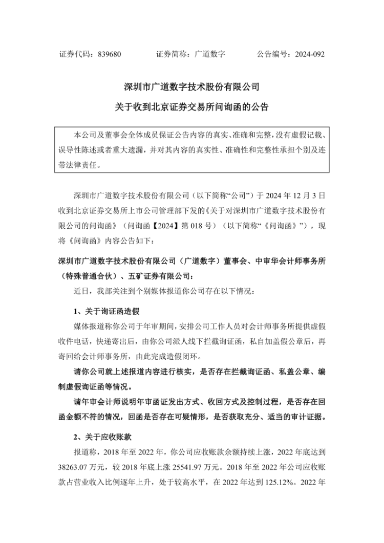12月3日,针对媒体报道其年审期间涉嫌拦截询证函、私盖公章、编制虚假询证函等行为,北交所对广道数字发出问询函,要求公司核实。