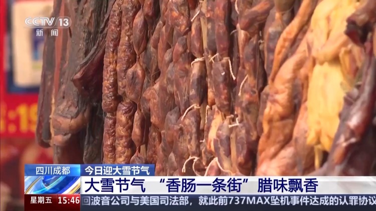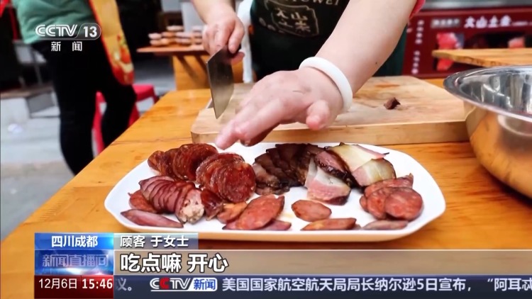 总台记者 赵雄:我现在是在成都青羊区的新开寺街,这条街也被当地人誉为香肠一条街。入冬以来,这里的人气可以说是越来越旺。我们在现场看到,很多商家也是挂满了香肠和腊肉,不少群众还有顾客也是围到了餐桌前,开始品尝各种不同的腊味。
