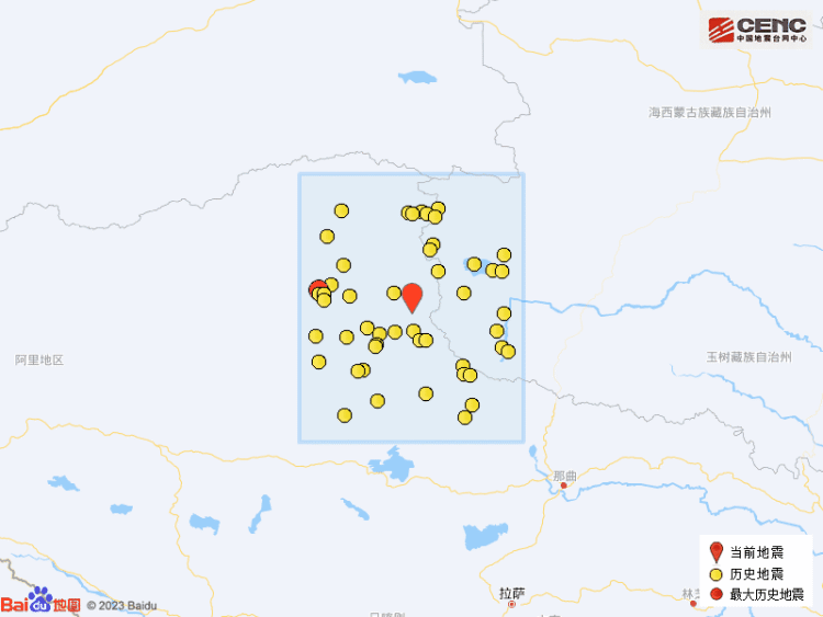 历史地震: 根据中国地震台网速报目录,震中周边200公里内近5年来发生3级以上地震共65次,最大地震是2021年3月30日在西藏那曲市双湖县发生的5.8级地震(距离本次震中154公里),按震级大小前50次历史地震分布如图。