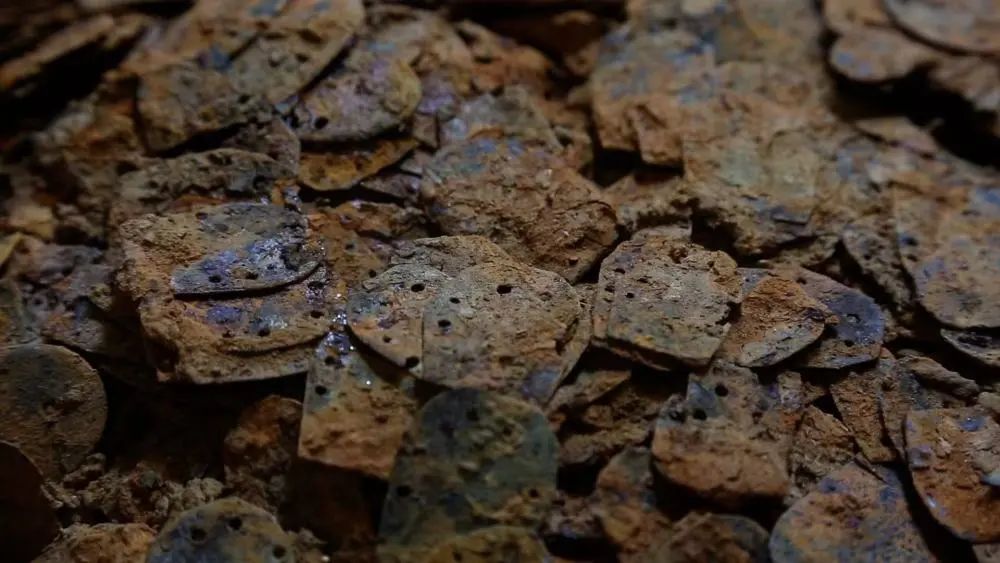 来自中国社会科学院考古研究所、科技考古与文化遗产保护重点实验室和江西省文物考古研究院等机构的文保人员,经过两年多时间从套箱中提取了约6000片甲片。文保人员经初步复原研究认为,刘贺墓出土的铠甲为铁漆、铜漆、皮漆复合材质编缀的鱼鳞甲。
