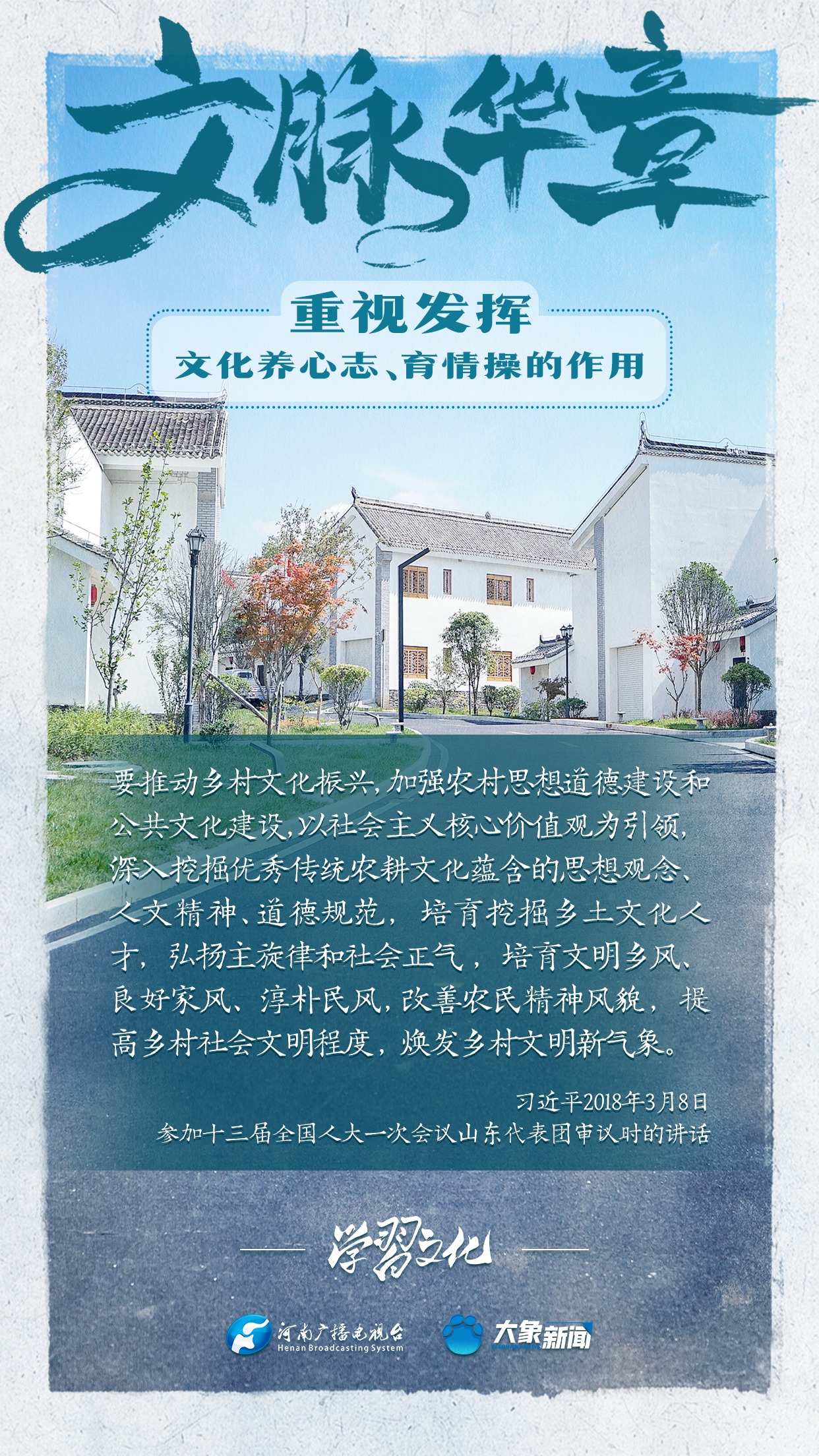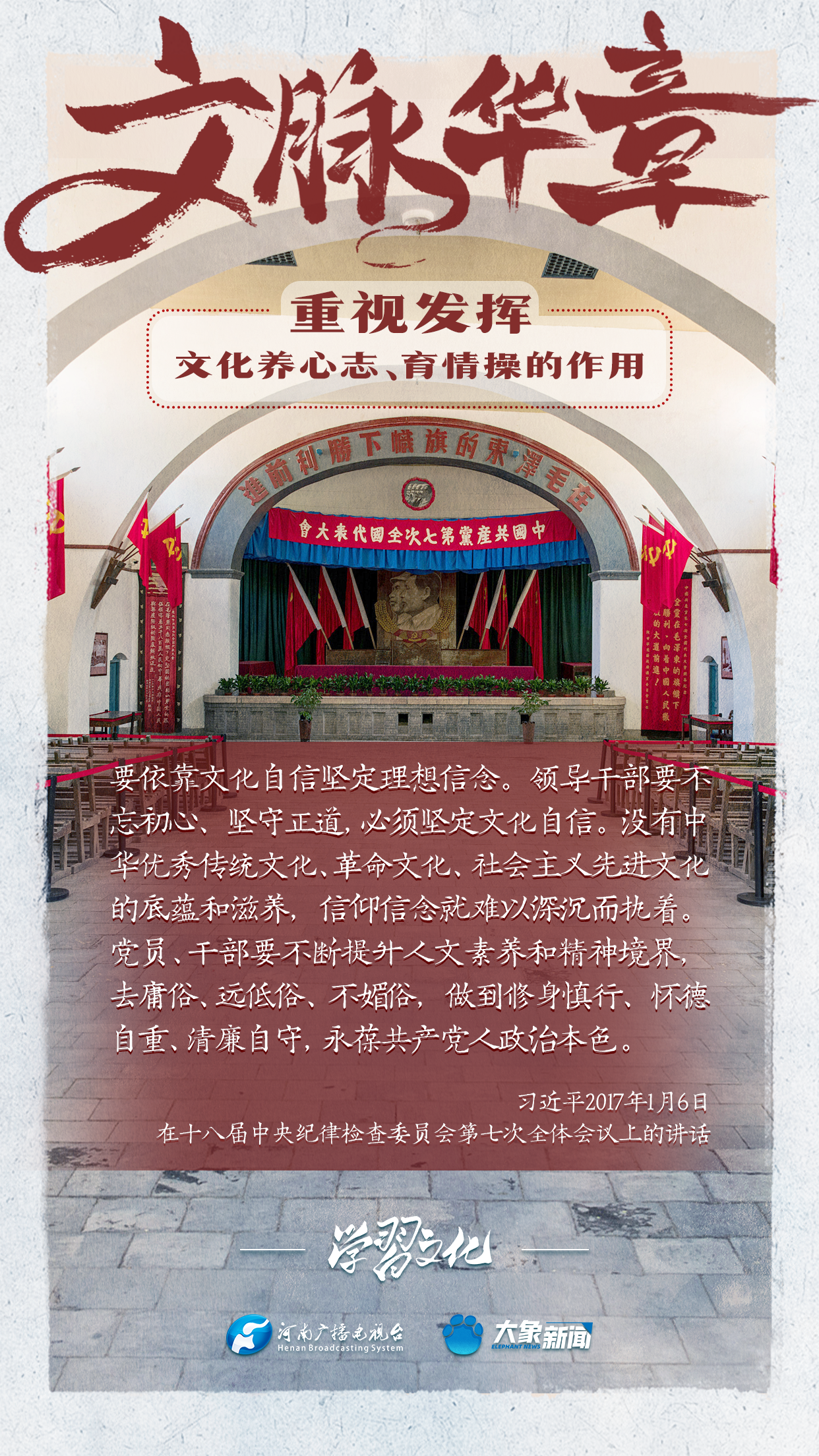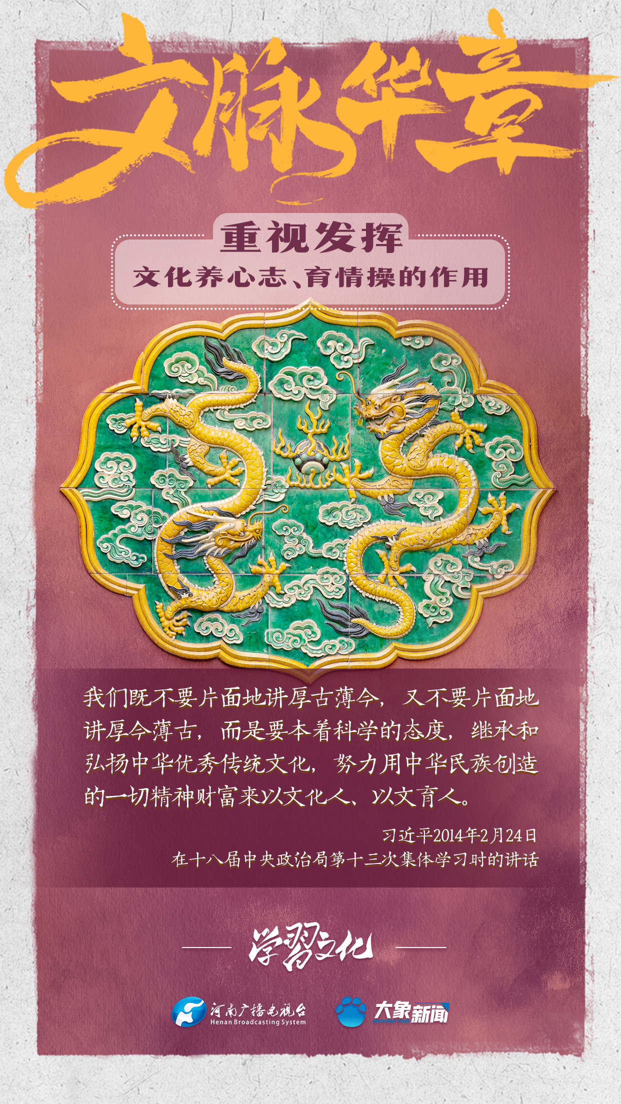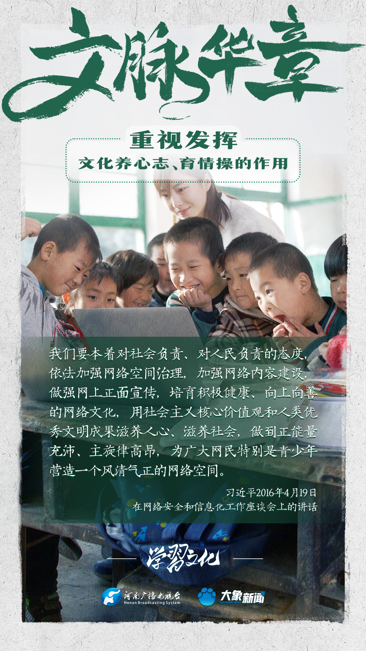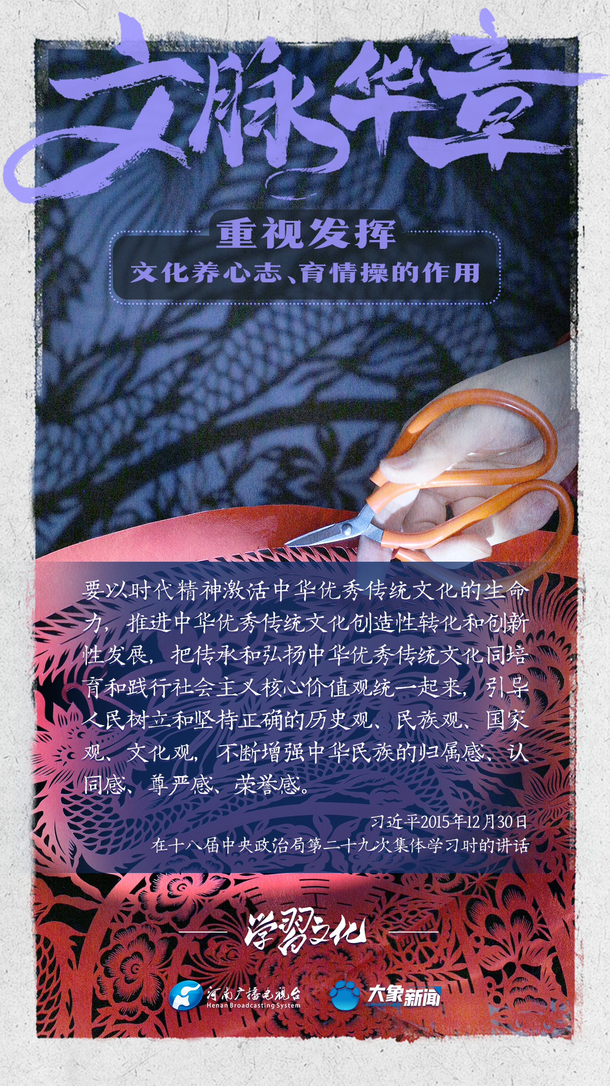 习近平总书记在主持中共中央政治局第十七次集体学习时强调,重视发挥文化养心志、育情操的作用,涵养全民族昂扬奋发的精神气质。总书记高度重视文化的作用,发表了一系列重要讲话,倡导以文载道、以文传声、以文化人。我们一起学习。