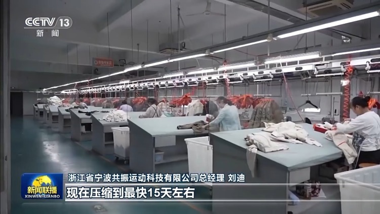 浙江省宁波共振运动科技有限公司总经理 刘迪:我们传统生产周期大约在90-100天。现在我们压缩到最快15天左右,我们必须得在管理和生产链条上要做到无缝衔接。