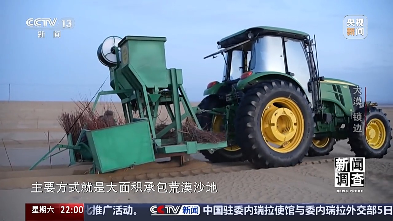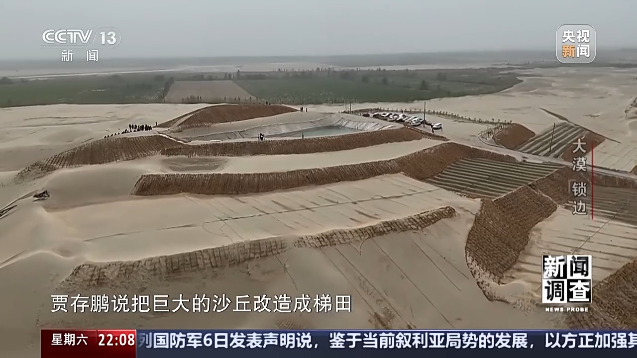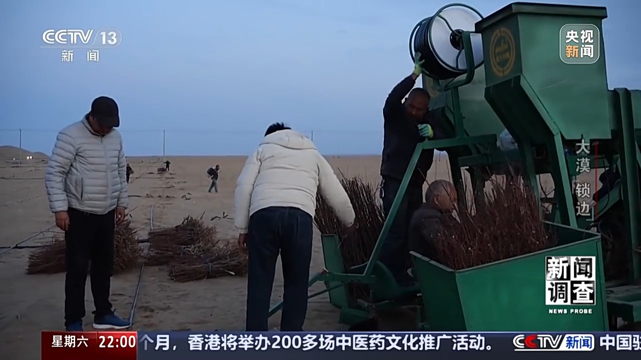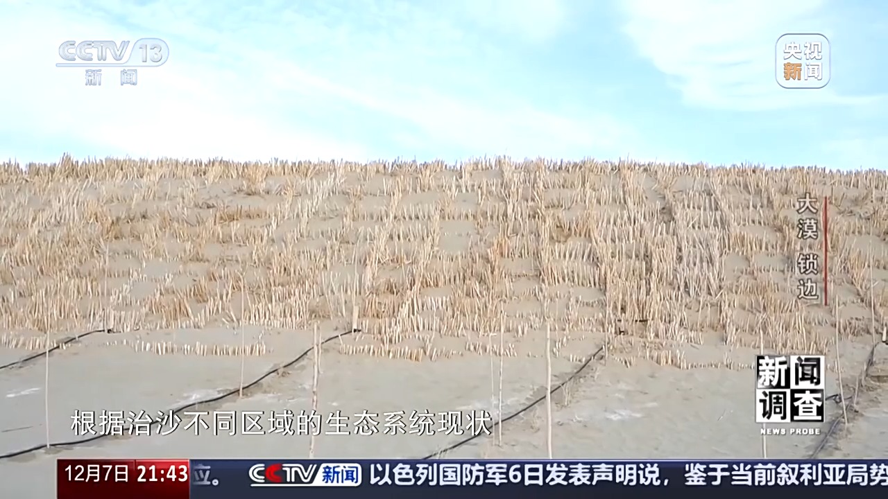 新疆于田县林业和草原局党组书记、副局长 贾存鹏:首先我们要到实地去勘测,只要能有水的,我们全部是生物治沙,没水的地方是草方格和高立式沙障治沙。