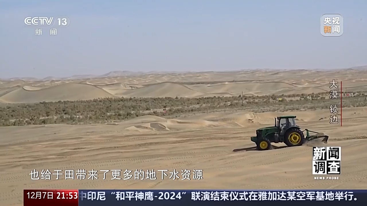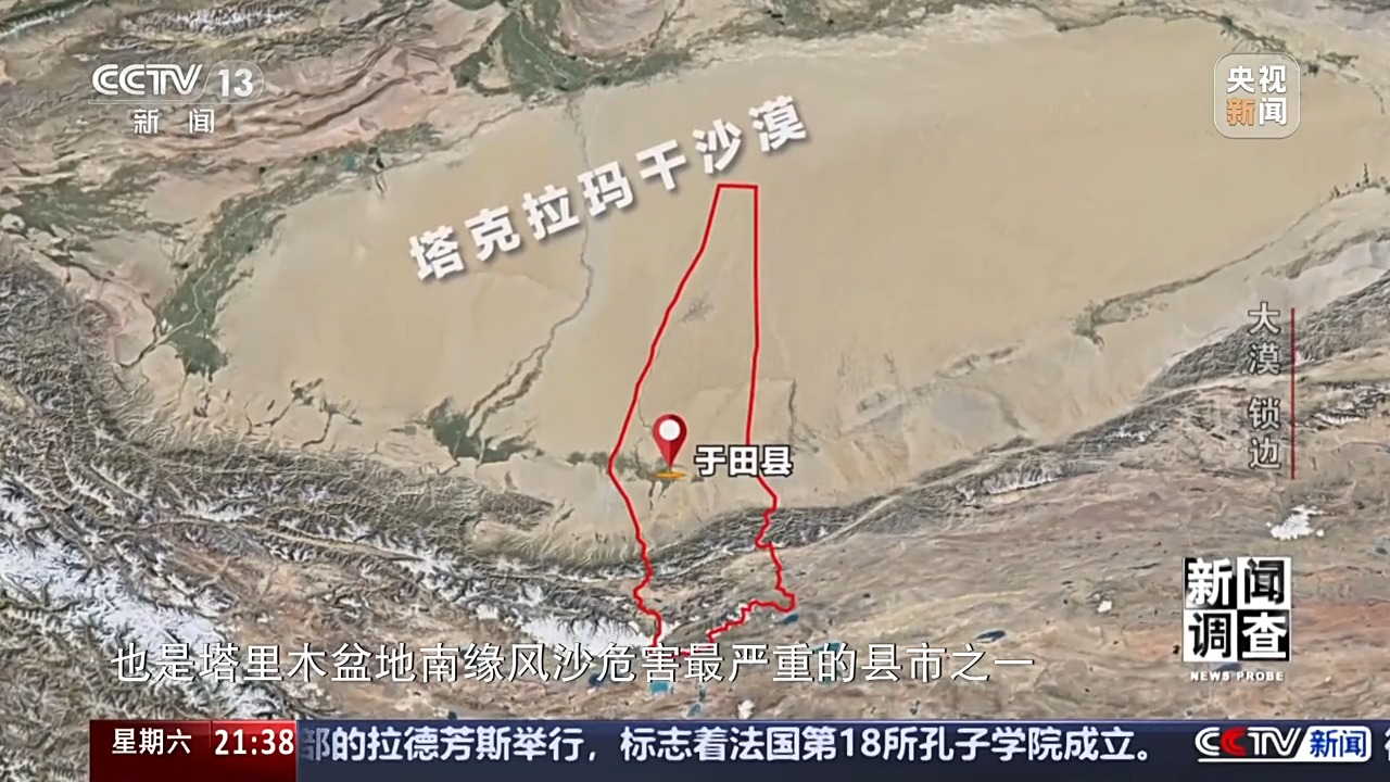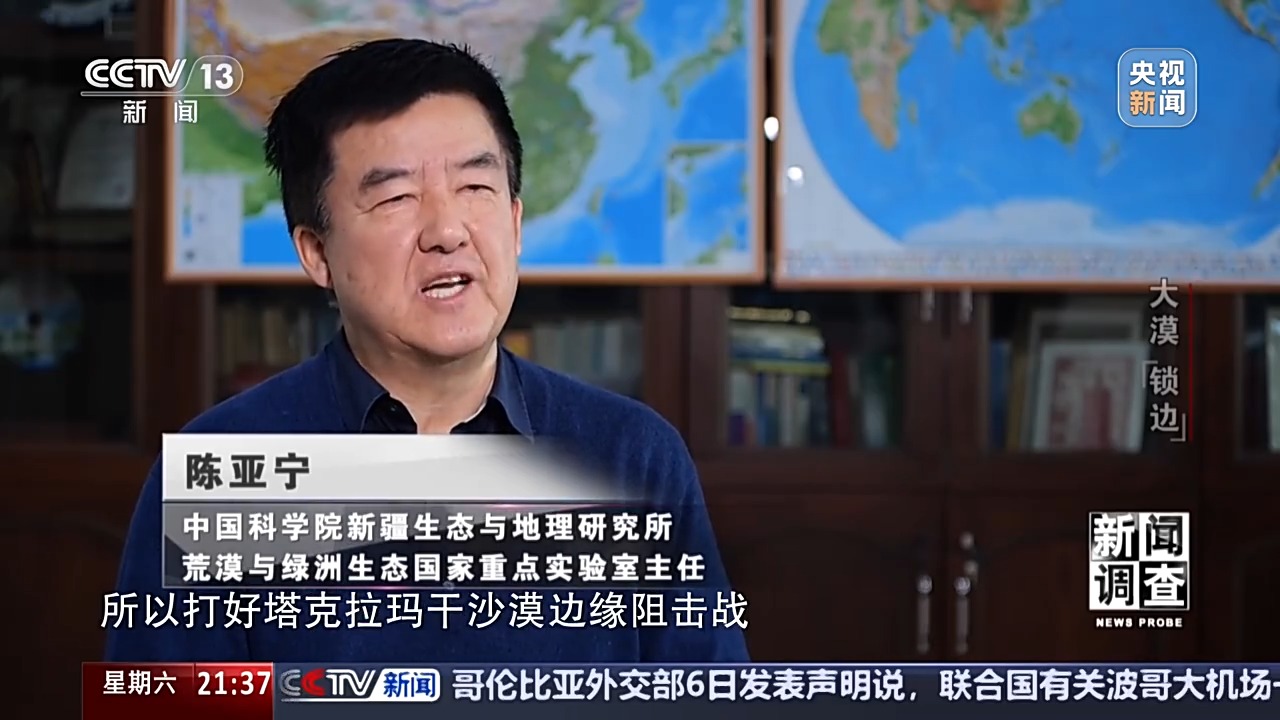中国科学院新疆生态与地理研究所荒漠与绿洲生态国家重点实验室主任 陈亚宁:和田地区大概就是256万人,由于人均耕地面积少,经济发展相对也滞后。也是脱贫攻坚成果巩固和拓展难度最大的一个区域,所以在打好塔克拉玛干沙漠边缘阻击战,对和田地区的经济社会发展、农民增收是有着重要意义的。我们带着队伍进行了将近两个多月的实体调研,那我们调查什么呢?第一这里的地理环境、自然生态条件、水资源情况,同时我们也收集到他们当地这么多年防沙治沙的一些成功经验和教训,我们也进行了访谈,结果我们就提出了一种从不同生态条件、不同沙害和不同水源条件下如何防沙治沙,实现沙漠锁边等一些建议、措施和总体规划。