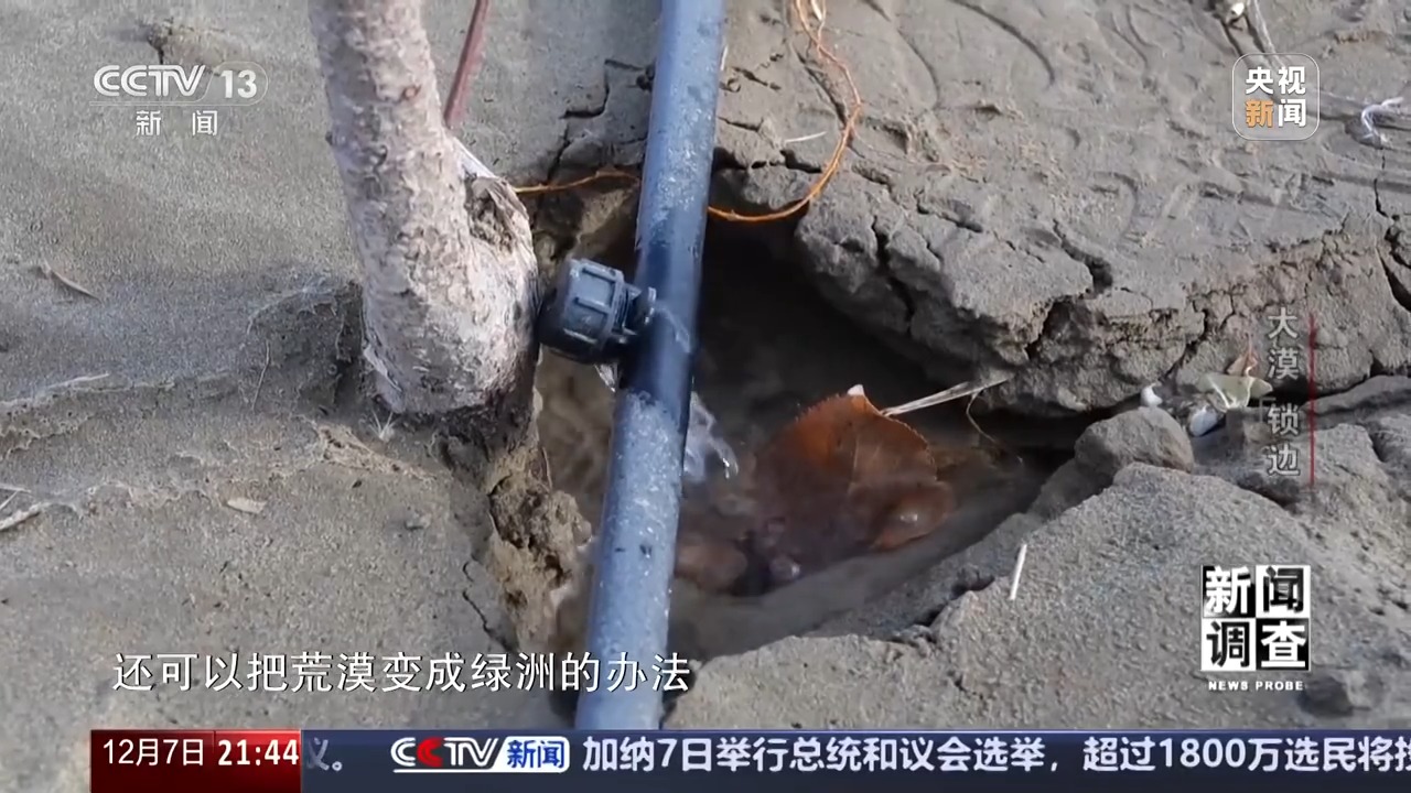在沙漠干旱地区,滴灌是非常成熟的灌溉技术,应用广泛。但贾存鹏觉得,再熟练的活儿也要干仔细,比如:滴灌带要保持压力均匀、树苗栽种的位置必须紧挨着水滴流出口。