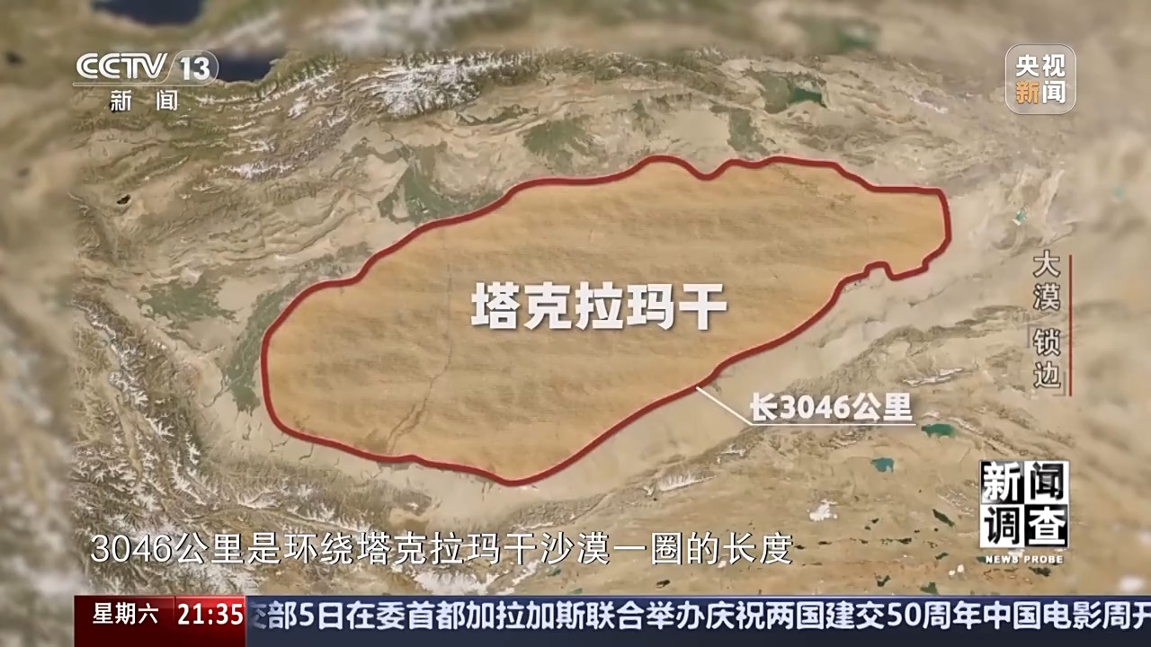 2023年6月,习近平总书记在内蒙古巴彦淖尔市主持召开加强荒漠化综合防治和推进“三北”等重点生态工程建设座谈会,强调要打好河西走廊——塔克拉玛干沙漠边缘阻击战等三大战役。3046公里,是环绕塔克拉玛干沙漠一圈的长度。过去40多年,依托“三北”防护林体系工程建设,塔克拉玛干沙漠周边已形成长达2761公里的绿色阻沙防护带。截至2023年底,还剩285公里的空白区。塔克拉玛干沙漠边缘阻击战的首要任务,就是要补齐缺口,给沙漠“锁边”。
