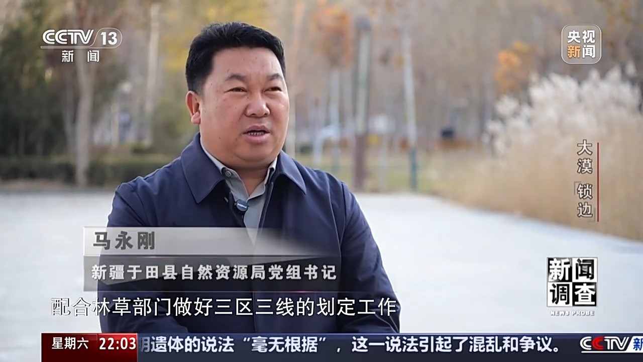 新疆于田县自然资源局党组书记 马永刚:于田县自然资源局在塔克拉玛干阻击战承担的就是项目的选址预审,配合林草部门做好三区三线的划定工作,三线主要审核了在我们的塔克拉玛干防沙治沙范围内是否占用了基本农田,是否占用了生态红线,是否存在有矿产压覆的现象,是否存在一些相关的土地纠纷问题,进行严格复核,并由林草、水利等相关部门同步出具相关的意见。