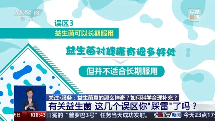 · 第三个误区:益生菌可以长期服用。这一点要提醒您,虽然益生菌对健康有很多好处,但并不适合长期服用。
