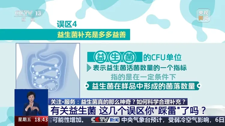· 第四个误区:益生菌补充是多多益善。我们经常在益生菌产品上,看见CFU标记。益生菌的CFU单位是用来表示益生菌活菌数量的一个指标。它指的是在一定条件下,益生菌在样品中形成的菌落数量。商家对于益生菌的宣传动辄含有8000亿(CFU)、1万亿(CFU)的数量,先不论拿到消费者手中真正还有多少活菌,单就益生菌本身而言,并不是补充越多越好。