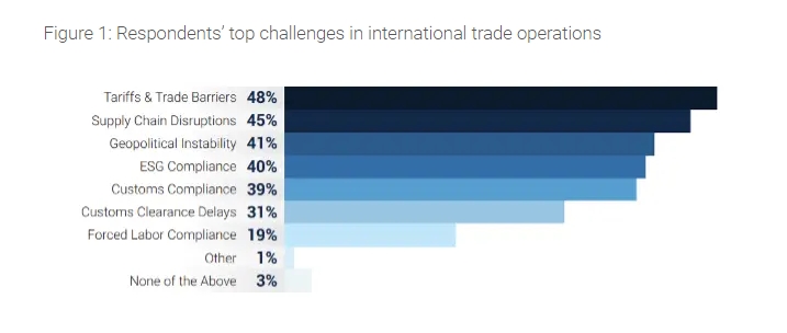 调查显示,48%的受访者认为关税和贸易壁垒上升是他们最担心的问题,紧随其后的是供应链中断(45%)和地缘政治不稳定(41%)。此外,无论所在公司规模大小,受访者都将关税和贸易壁垒列为当前面临的首要问题。这项报告共调查了978名来自欧洲、北美、南美和亚太地区主要贸易国的供应链领域领导者。
