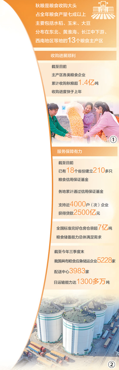 据国家粮食和物资储备局相关负责人介绍,河南、江苏、黑龙江、安徽已相继启动中晚稻托市收购,收购进展总体顺利,市场平稳运行。作为粮食收购信贷主渠道,中国农业发展银行已先期安排2000亿元信贷资金专项用于今年秋粮收购,后续根据收购需要随时增加。中国建设银行、中国农业银行等商业银行加大粮食信贷投放,支持粮食收购、加工、应急供应、仓储设施建设等。同时充分发挥粮食信用保证基金作用,截至目前,已有18个省份建立210多只基金,规模合计70多亿元,各地累计通过信用保证基金支持近4000户(次)企业获得贷款2500亿元。