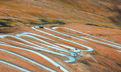 西藏自治区日喀则市定日县加乌拉山的珠峰108拐公路蜿蜒曲折,形成高原地形条件下特有的公路景象。