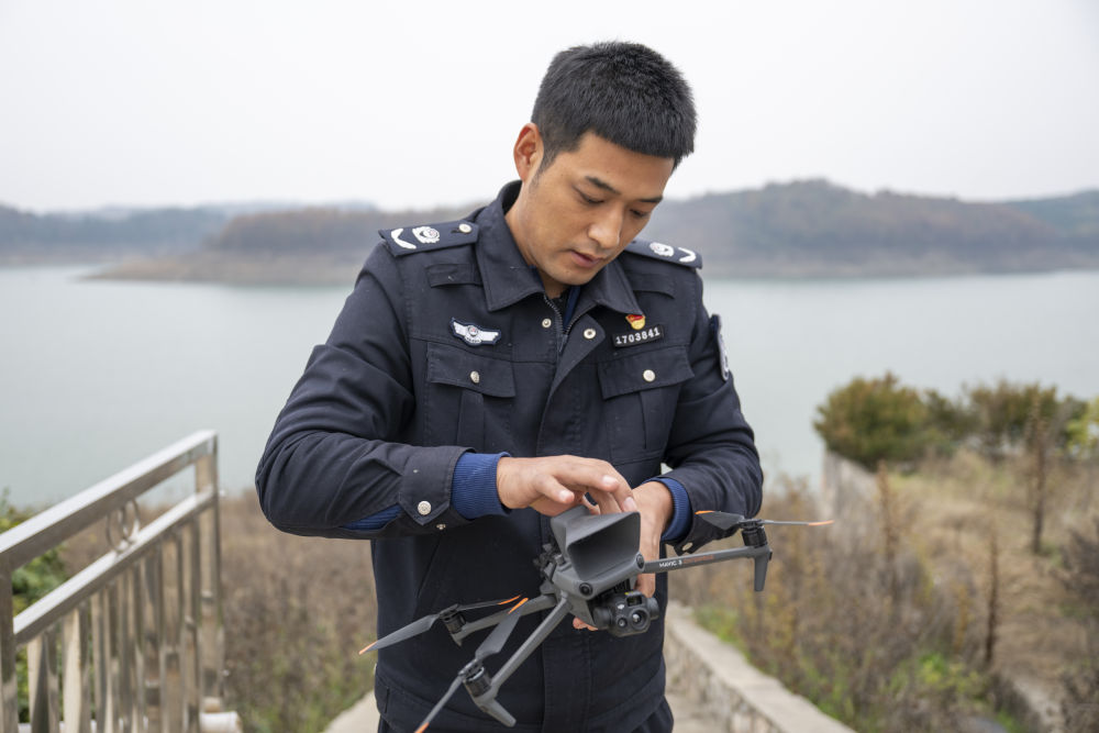 2024年12月8日,丹江口市库区综合执法大队六中队执法队员在操作无人机。
