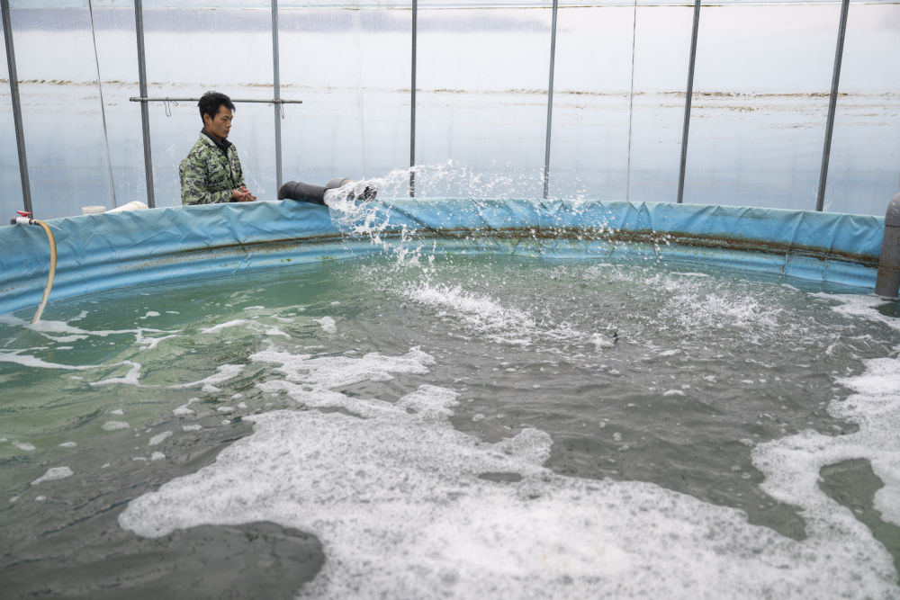 2024年12月8日,湖北农发(丹江口)渔业科技有限公司工作人员在给鱼池放水。品质调控车间内的尾水经过四级沉淀池后排入生态塘净化处理,后进行循环使用从而减少污染。