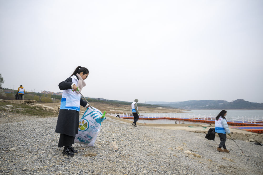 2024年11月28日,清漂志愿者在南阳市淅川县鹳河流域城区段作业。