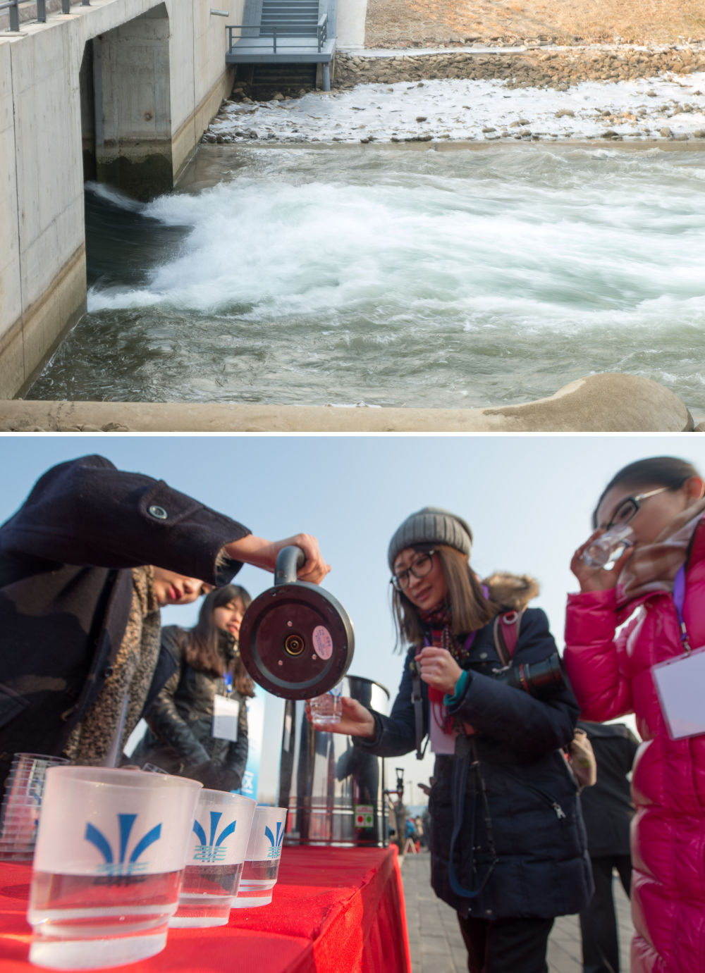 2014年12月27日,南水北调中线一期工程总干渠终点团城湖明渠开闸放水(上图);参加通水仪式的嘉宾在北京品尝了来自丹江口的水(下图,拼版照片)。